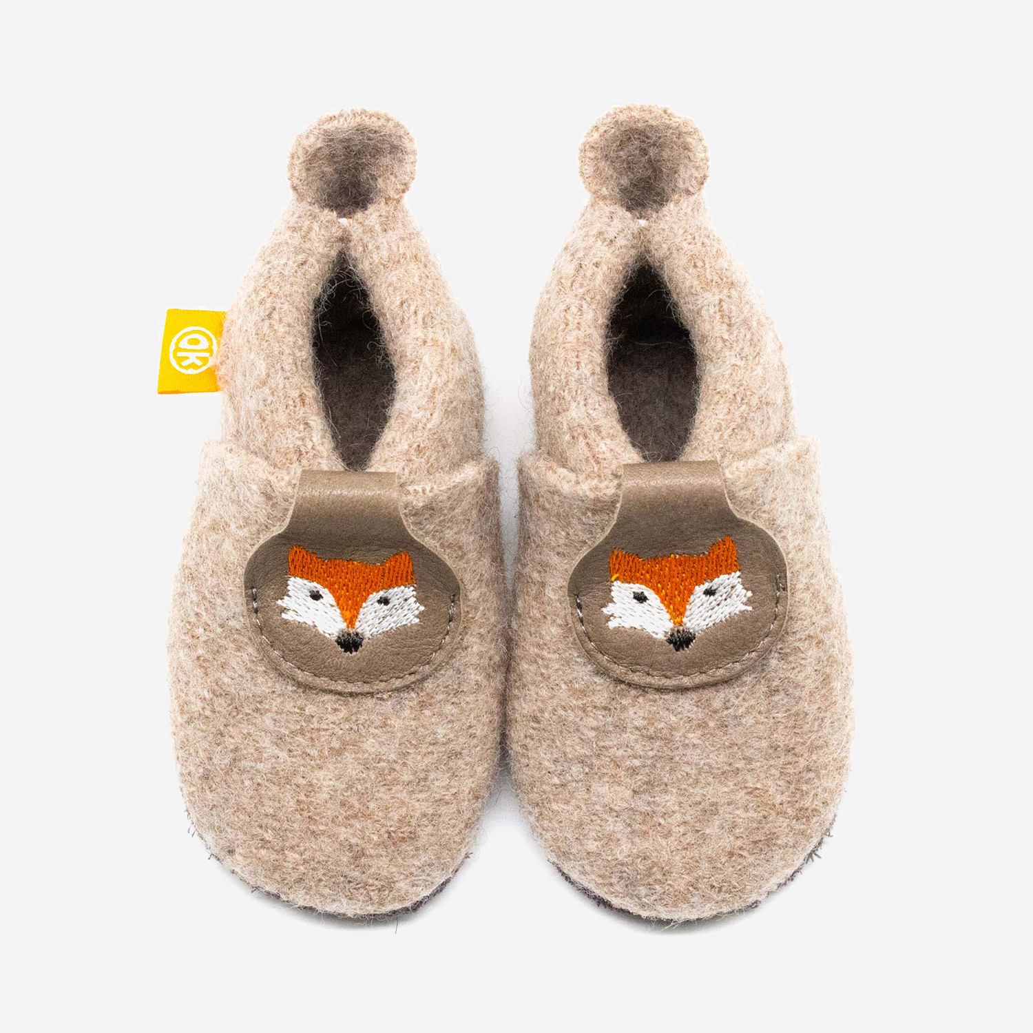 Kinder-Hausschuhe aus 100% Merinowolle von Orangenkinder®: Frech & neugierig – stiehlt aber keine Gänse 🦊 Die Orangenkinder® Poppies überzeugen durch ihr schlichtes Design und die liebevollen Stickmotive auf der Lasche.