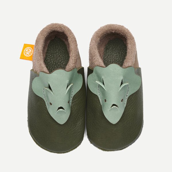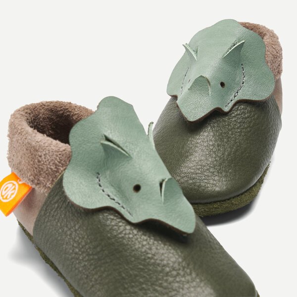 Kinder-Hausschuhe und Krabbelschuhe in 3D von Orangenkinder®: Unser Dino ist genau genommen ein Triceratops. Er kommt aus der Urzeit direkt auf deine Schuhe und begleitet Dich überall hin. 🦖