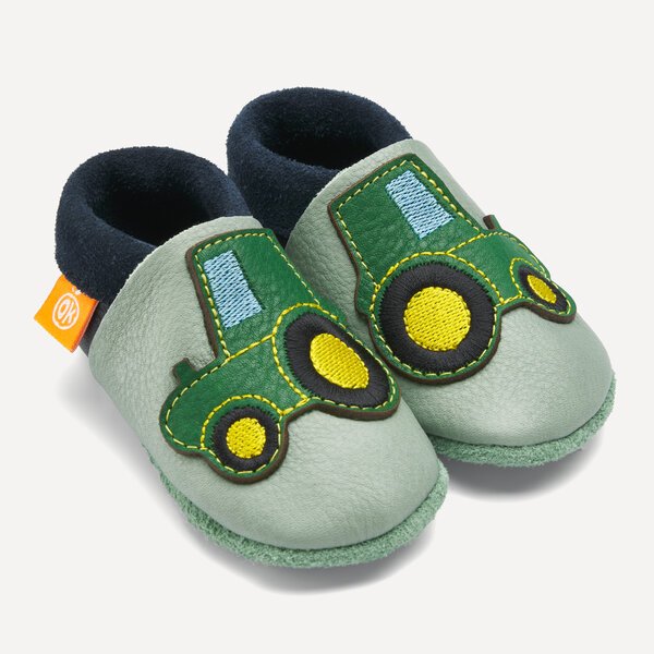 Kinder-Hausschuhe und Krabbelschuhe von Orangenkinder®: Orangenkinder sind gerne in der Natur unterwegs. Hier bei uns im Frankenland ist die Landwirtschaft stark verbreitet und unser Herbert der Traktor ist den ganzen Tag an der frischen Luft. Verstärkung im Kinderzimmer mit starkem Traktor-Motiv Herbert!